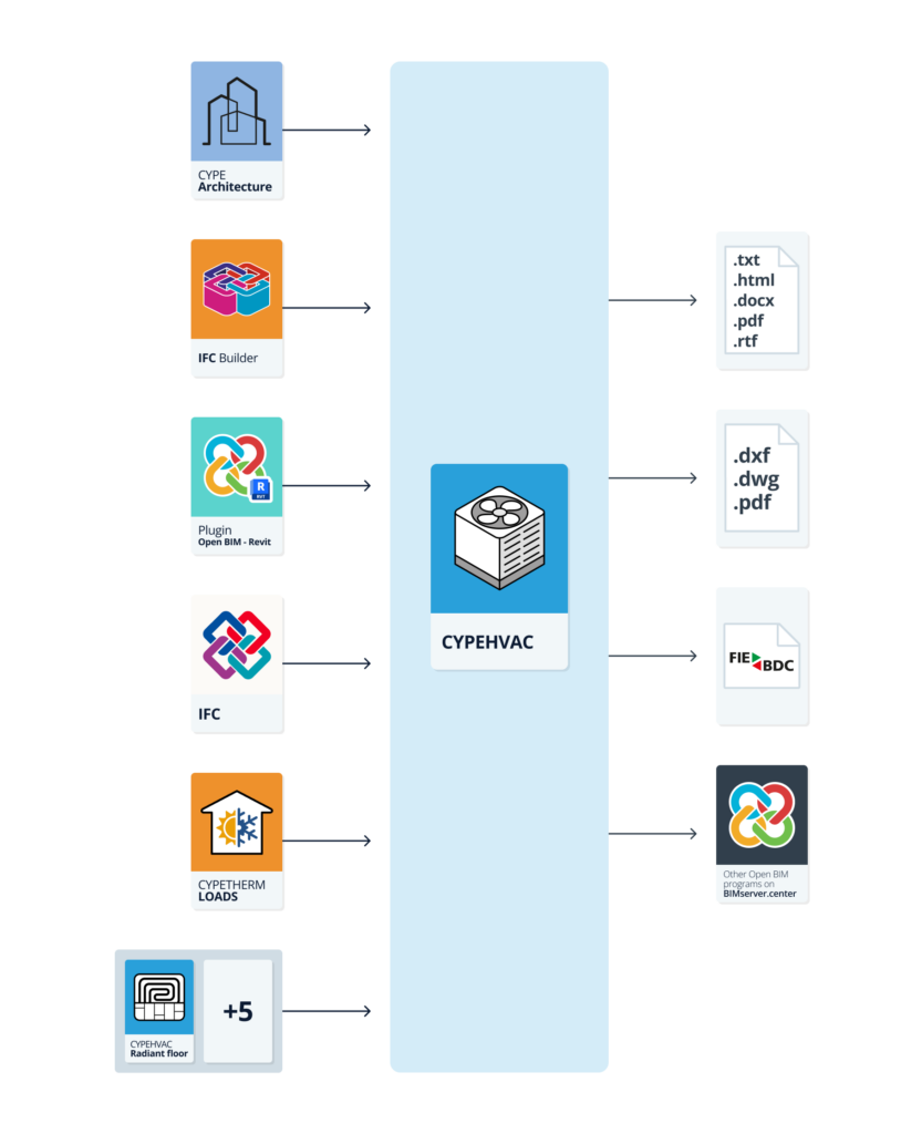 - Exporting the information generated with CYPEHVAC to the BIMserver.center platform using IFC and glTF formats. This allows it to be viewed by authorised project participants. The information generated by CYPEHVAC can be used by the following programs: