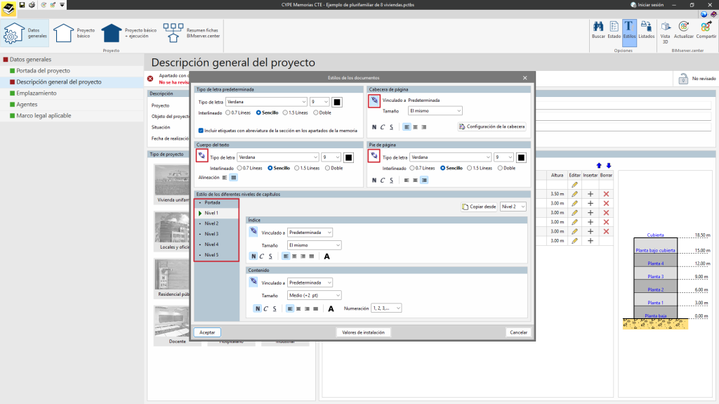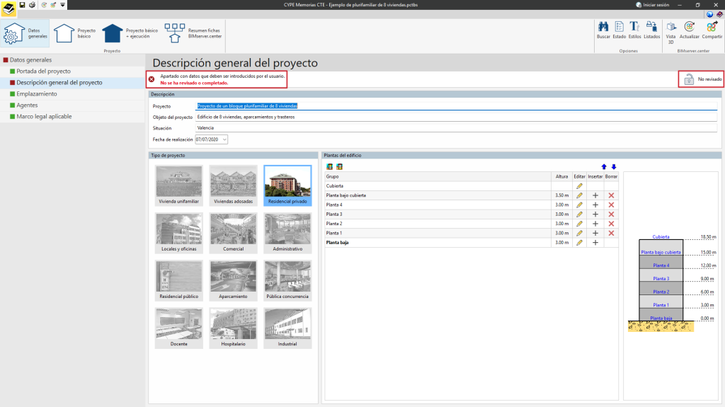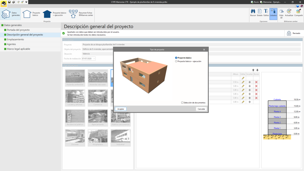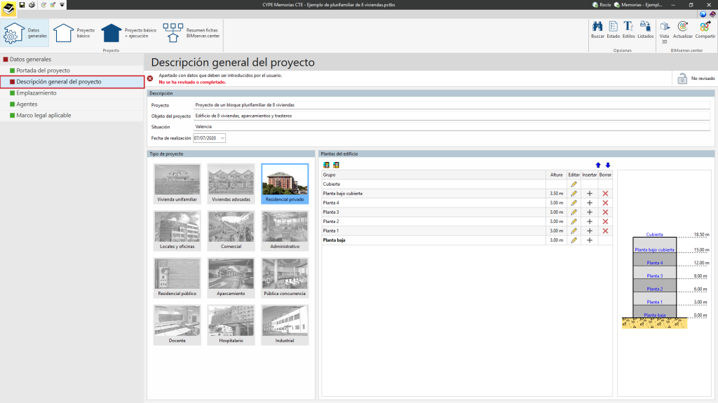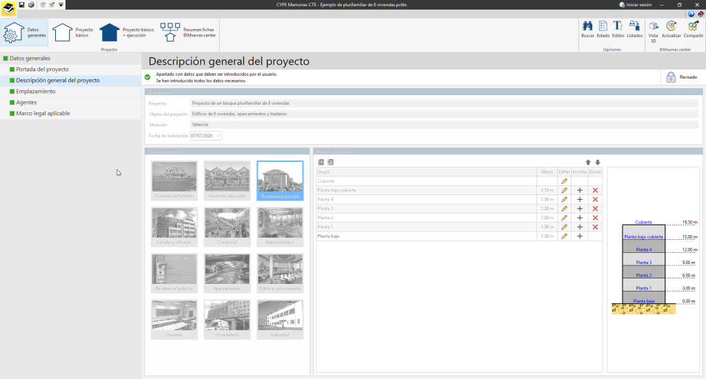 También se puede configurar el apartado "Descripción general del proyecto", indicando el tipo de edificio; como viviendas unifamiliares, edificios comerciales u hospitales, entre otros.