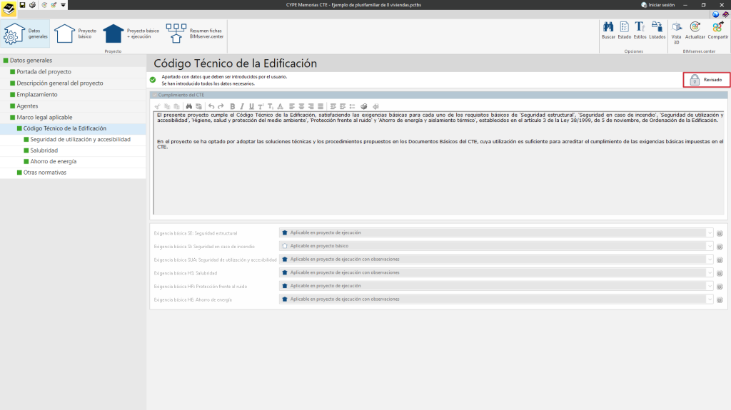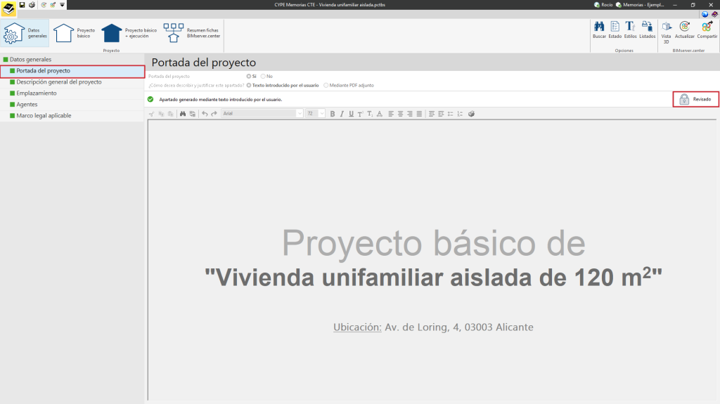 Los apartados de las secciones "Datos generales", "Proyecto básico" o "Proyecto básico + ejecución" que permiten la introducción directa de textos o que disponen de un asistente de introducción de datos también cuentan con esta herramienta en su cabecera.- Cuando el icono del candado está abierto, aparece el texto No revisado.