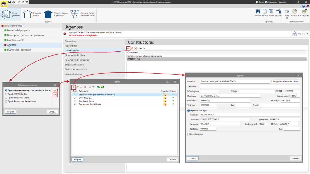 El apartado "Agentes" permite definir los intervinientes en el proyecto, como promotores, proyectistas y constructores, y asignarles sus roles.