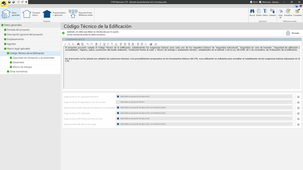 En este apartado se introducen las distintas exigencias del CTE, que pueden modificarse para personalizarlas según cada proyecto, utilizando las herramientas de edición de texto.