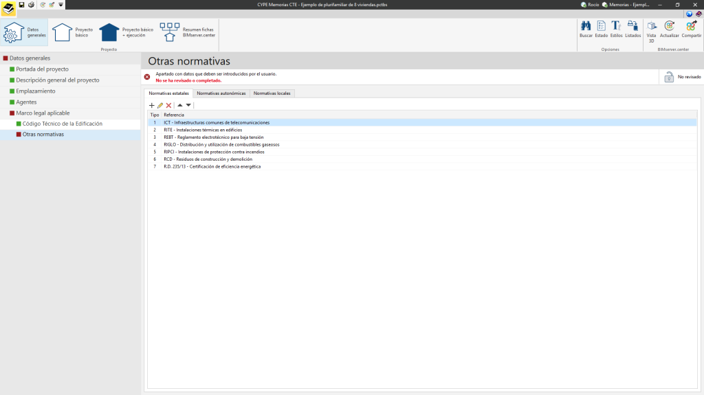 Aquí se centraliza la gestión de la normativa aplicable. Este apartado se divide en dos subapartados: "Código Técnico de la Edificación" y "Otras normativas".