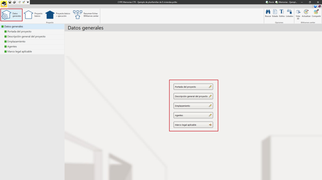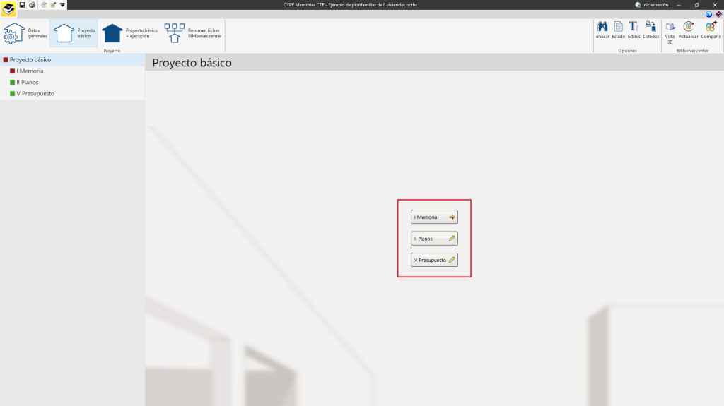 Se debe importar o completar únicamente la información solicitada en la sección "Proyecto básico", sin preocuparse por los apartados que pertenecen exclusivamente a la memoria del proyecto de ejecución. - Obtención de la memoria del proyecto básico + ejecución