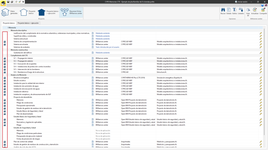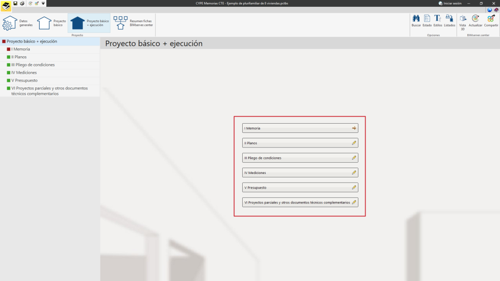 El menú lateral de las secciones "Proyecto básico" y "Proyecto básico + ejecución" sigue el orden de apartados establecido en el Anejo I, Parte I, del CTE.