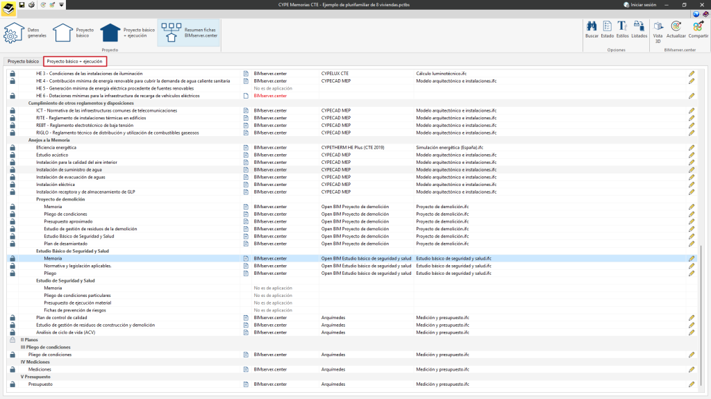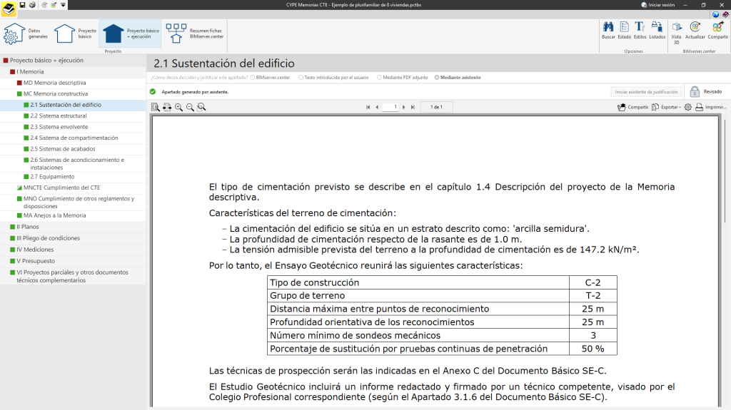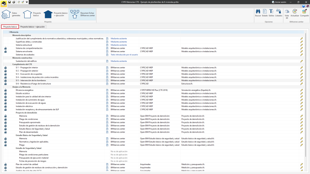 En estas secciones se estructuran los apartados necesarios para generar el "Proyecto básico" y el "Proyecto básico + ejecución". La información se obtiene a partir de los datos contenidos en los ficheros del modelo BIM, los proporcionados por CYPE Memorias CTE o los introducidos manualmente mediante asistentes, texto directo o documentos PDF.
