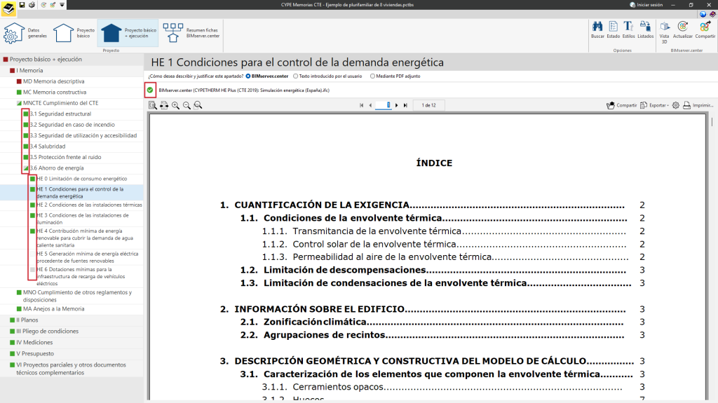 Con toda la información cumplimentada, CYPE Memorias CTE genera, desde la opción "Listados", el documento del "Proyecto básico" y el "Proyecto básico + ejecución", con la siguiente estructura:
