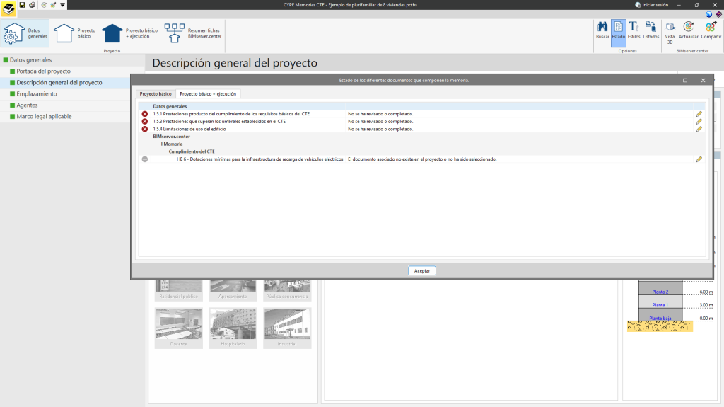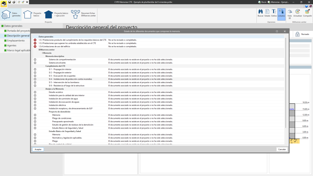 Esta codificación permite identificar rápidamente los apartados que aún se deben cumplimentar. Además, el programa puede generar un informe que enumera todos los documentos del "Proyecto básico" o del "Proyecto básico + ejecución" que no están marcados como revisados o que no tienen un fichero asociado.