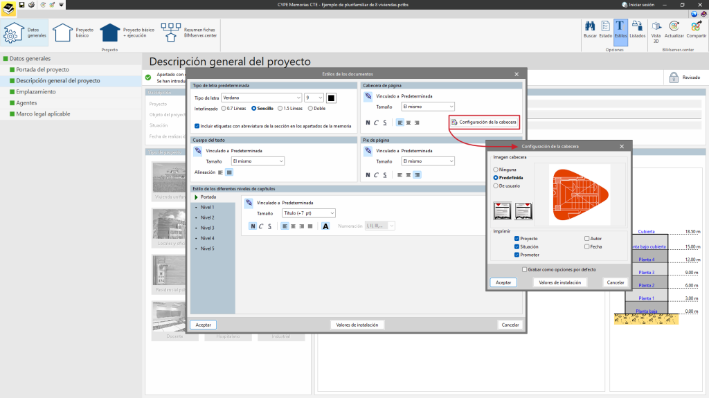 - Desde "Configuración de la cabecera" también es posible añadir una imagen y marcar los datos generales que se desean incluir (proyecto, situación, promotor, autor y fecha).