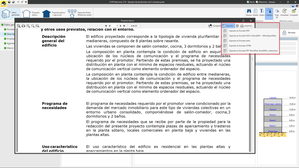 - Memoria del "Proyecto básico" y "Proyecto básico + ejecución" en diferentes formatos, como TXT, HTML, DOC, PDF o RTF.