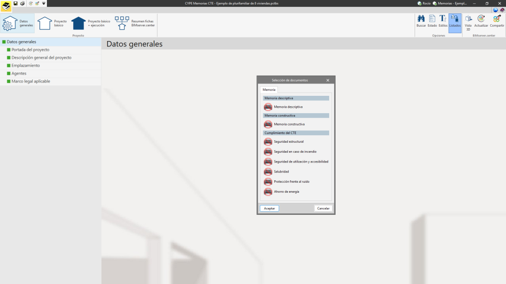 A la hora de generar los listados, el programa muestra la opción "Selección de documentos", que permite especificar qué partes se desean generar de las memorias del "Proyecto básico" o del "Proyecto básico + ejecución".
