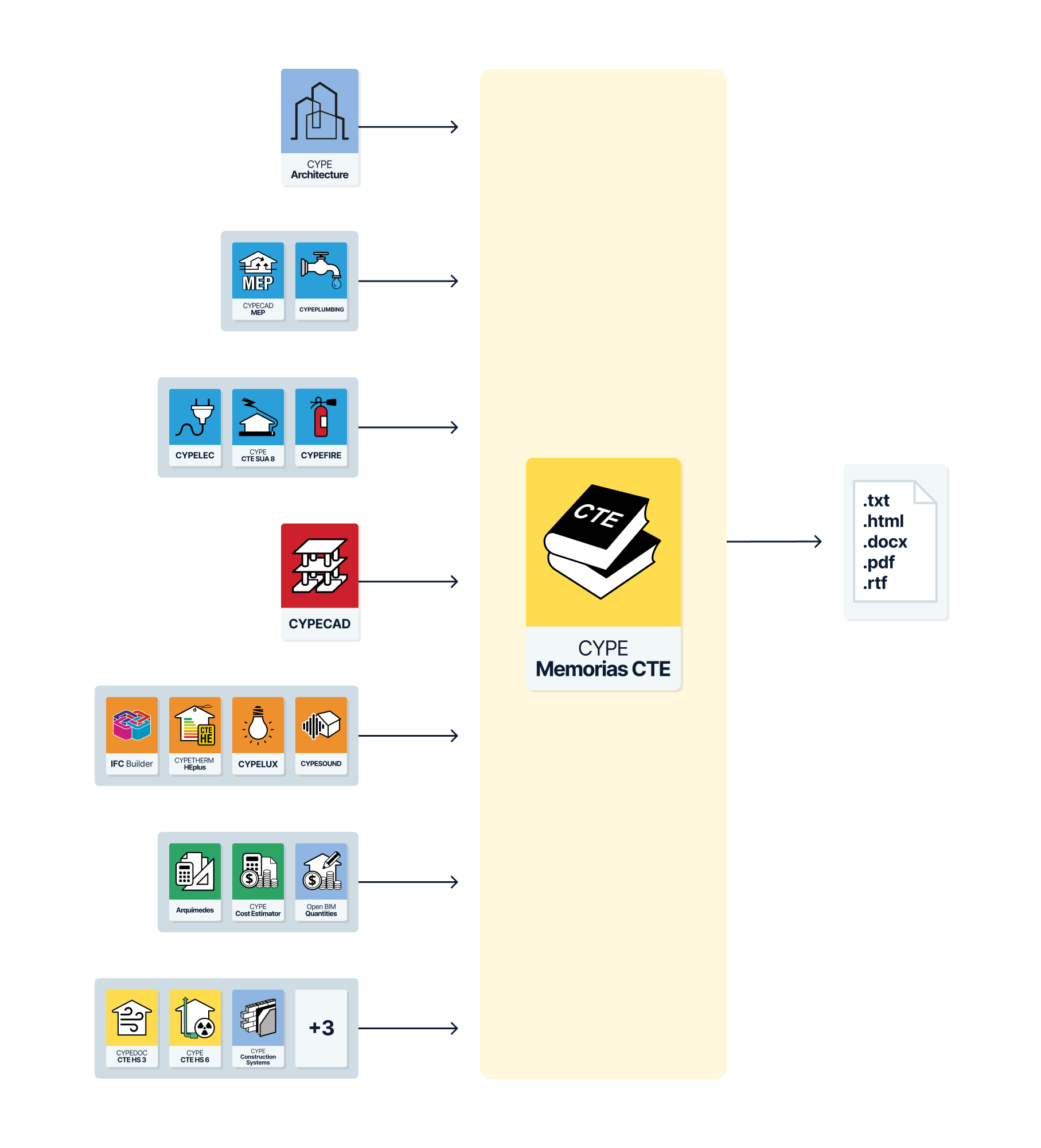 CYPE Memorias CTE es un programa diseñado para generar y gestionar un proyecto de edificación (memoria del proyecto básico, memoria del proyecto básico + ejecución, planos, pliego de condiciones, mediciones y presupuesto) con el contenido y el orden establecidos en Anejo I. Contenido del proyecto, de la Parte I del CTE, así como en el Manual del Proyecto Arquitectónico del CSCAE.