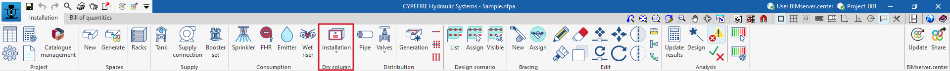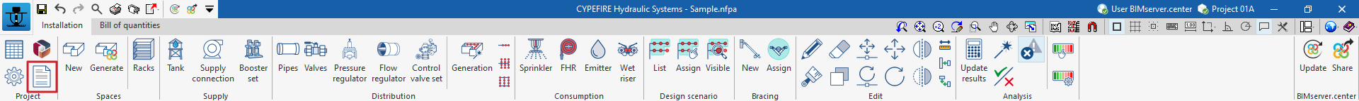 Si l'ouvrage de CYPEFIRE Hydraulic Systems est lié à un projet BIM de la plateforme BIMserver.center, les actions suivantes peuvent être réalisées :
