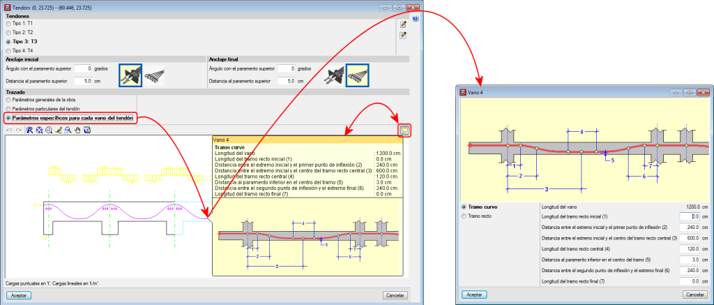 Esta opción permite editar cada vano de un tendón para dar a su trazado características diferentes a los otros vanos del mismo tendón. Cada vano puede definirse como tramo curvo o recto. Si se define como tramo curvo las características del trazado que se pueden modificar son:- Longitud del vano (No se puede editar y solo se muestra a nivel informativo)