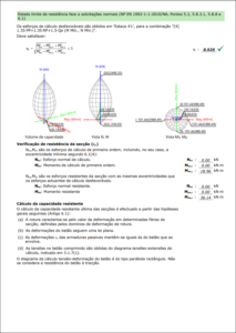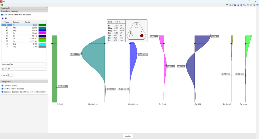 Os esforços e deslocamentos obtidos em cada ponto podem ser visualizados no ecrã e exportados para um ficheiro CSV. Além disso, se a sua licença incluir o módulo “Estacas II: Verificação estrutural”, os esforços calculados são utilizados para verificar a armadura da secção da estaca de acordo com os regulamentos aplicáveis.