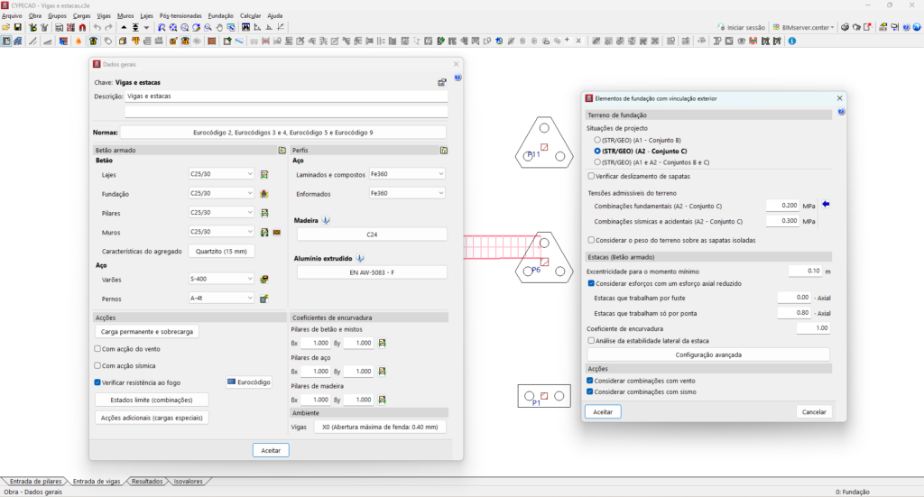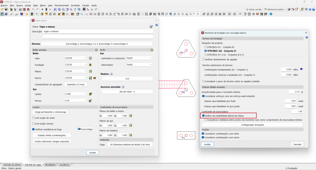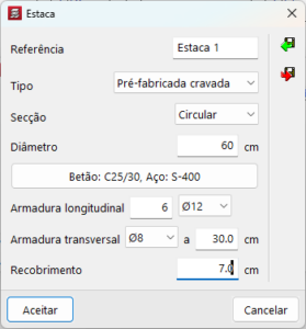 Implementado nesta versão (2025.d), Estacas II: Verificação estrutural permite definir facilmente a secção transversal das estacas e a sua armadura, e assim verificar a sua resistência aos esforços solicitantes transmitidos pelo maciço de encabeçamento à cabeça da estaca. Mais informações sobre este módulo podem ser encontradas em “Estacas II: Verificação estrutural (novo módulo)” nas novas funcionalidades desta versão.