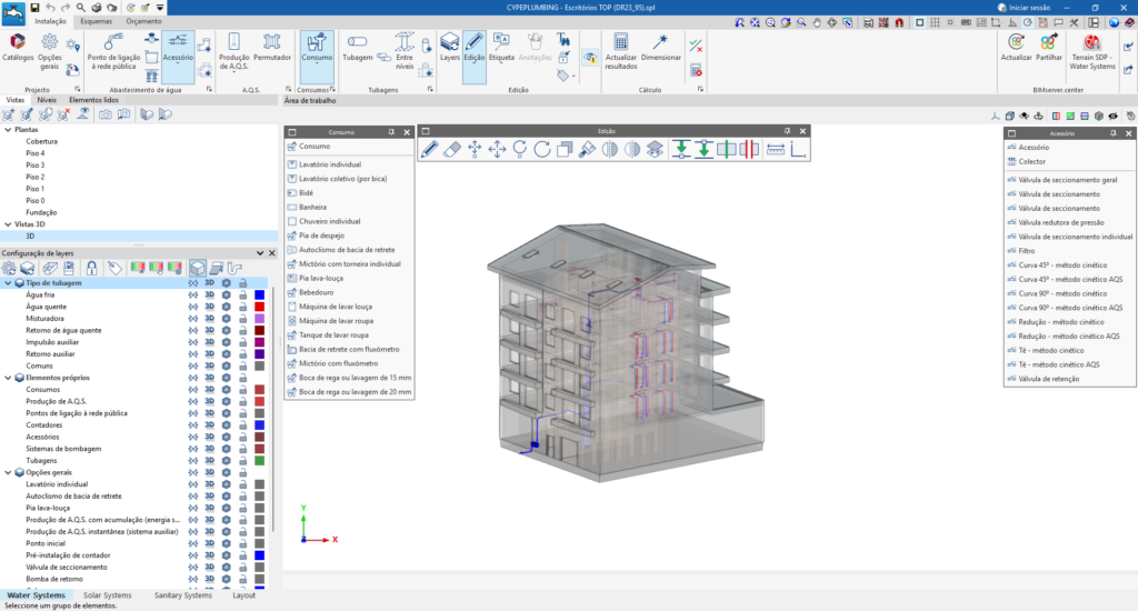 Implementou-se a segunda parte ("Kanalizacja sanitarna - Projektowanie układu i obliczenia") e a terceira parte ("Przewody deszczowe - Projektowanie układu i obliczenia") da norma polaca PN-EN 12056-3:2002 ("Systemy kanalizacji grawitacyjnej wewnątrz budynków").