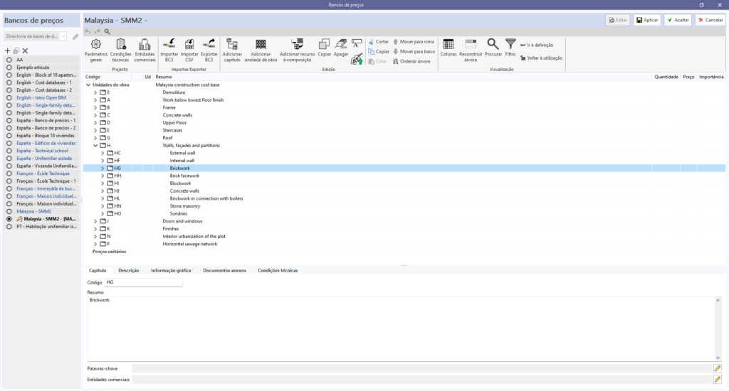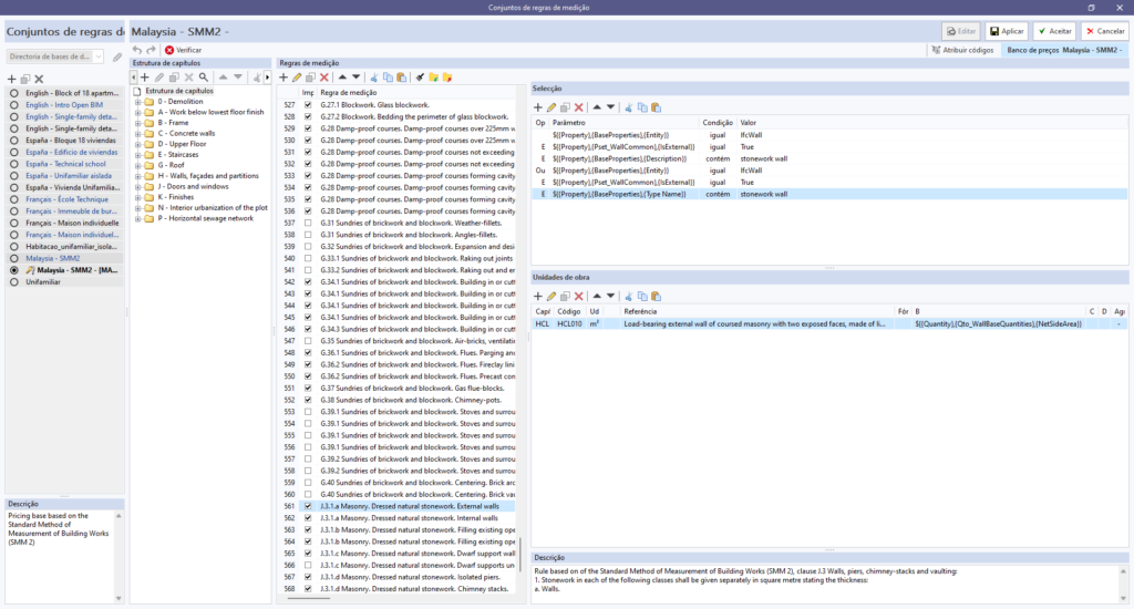 Convém lembrar que o acesso ao banco de preços é feito a partir do botão “Bancos de preços” e o acesso aos conjuntos de regras é feito a partir do botão “Conjuntos de regras de medição”. O banco de preços contém unidades de obra não classificadas e não orçamentadas, organizadas de acordo com os critérios de capítulo e subcapítulo normalmente seguidos nos orçamentos da Malásia. Um banco de preços permite ao utilizador atribuir unidades de obra aos critérios de medição que entende, neste caso, o conjunto de regras foi criado para a Malásia, de forma a transformar os dados contidos nos elementos ou componentes de um modelo BIM em unidades de obra.