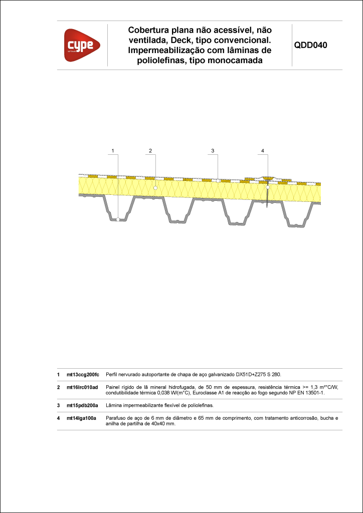 - QDD040. Cobertura plana não acessível, não ventilada, Deck, tipo convencional. Impermeabilização com lâminas de poliolefinas, tipo monocamada.