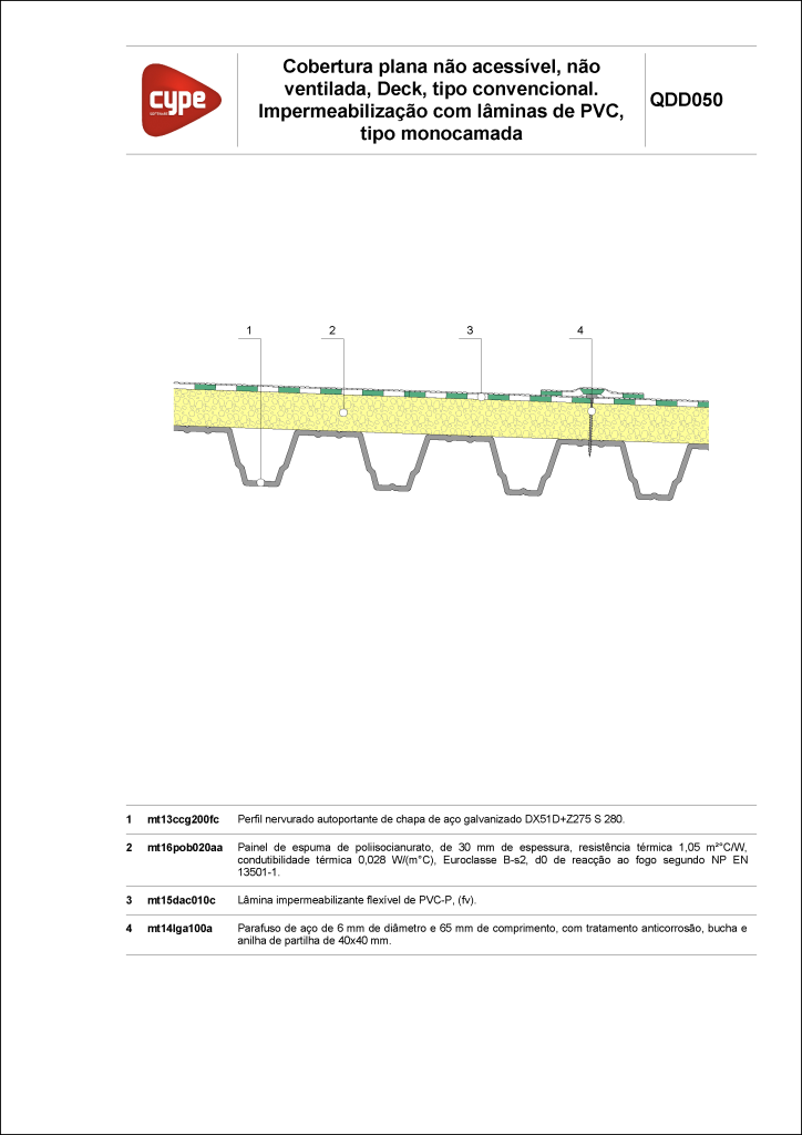 - QDD050. Cobertura plana não acessível, não ventilada, Deck, tipo convencional. Impermeabilização com lâminas de PVC, tipo monocamada.