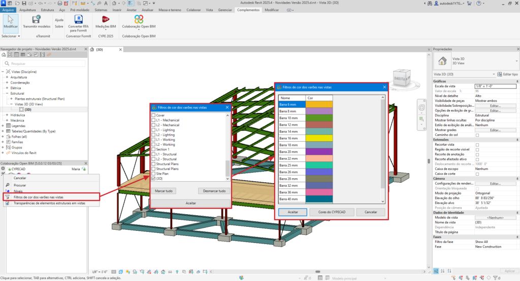 Esta funcionalidade possibilita a atribuição de cores às armaduras em função do seu diâmetro para as vistas disponíveis que o utilizador selecionar, sem necessidade de criar um filtro para cada uma. As cores são configuráveis pelo utilizador, existindo sempre a possibilidade de selecionar o conjunto de cores utilizado pelo programa de cálculo original.