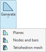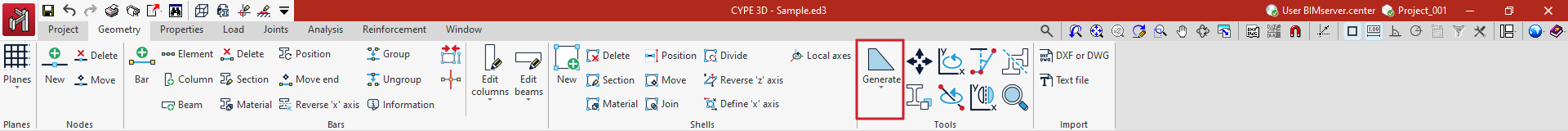 Para gerar automaticamente planos, nós, barras e malhas de tetraedros no CYPE 3D, são utilizadas as opções do menu “Gerar”, disponível no grupo “Ferramentas” na parte superior da interface, dentro do separador “Geometria” (separador inferior “Estrutura”).