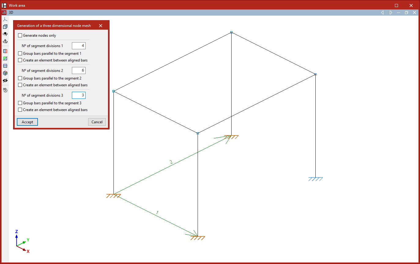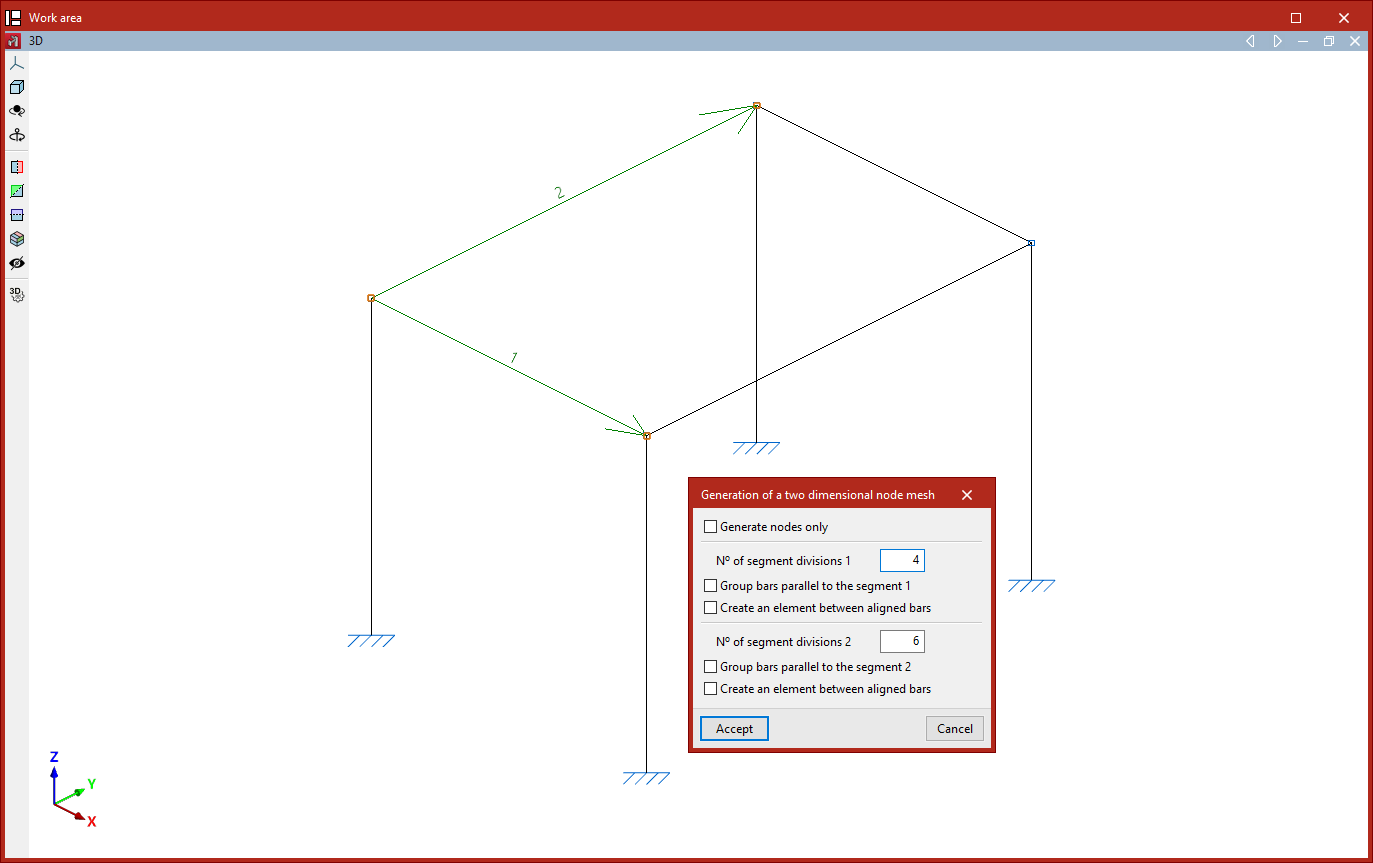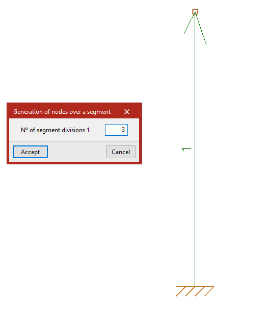 A opção seguinte do menu “Gerar”, “Nós e barras”, permite gerar nós e barras indicando os segmentos de geração e o número de divisões por segmento.