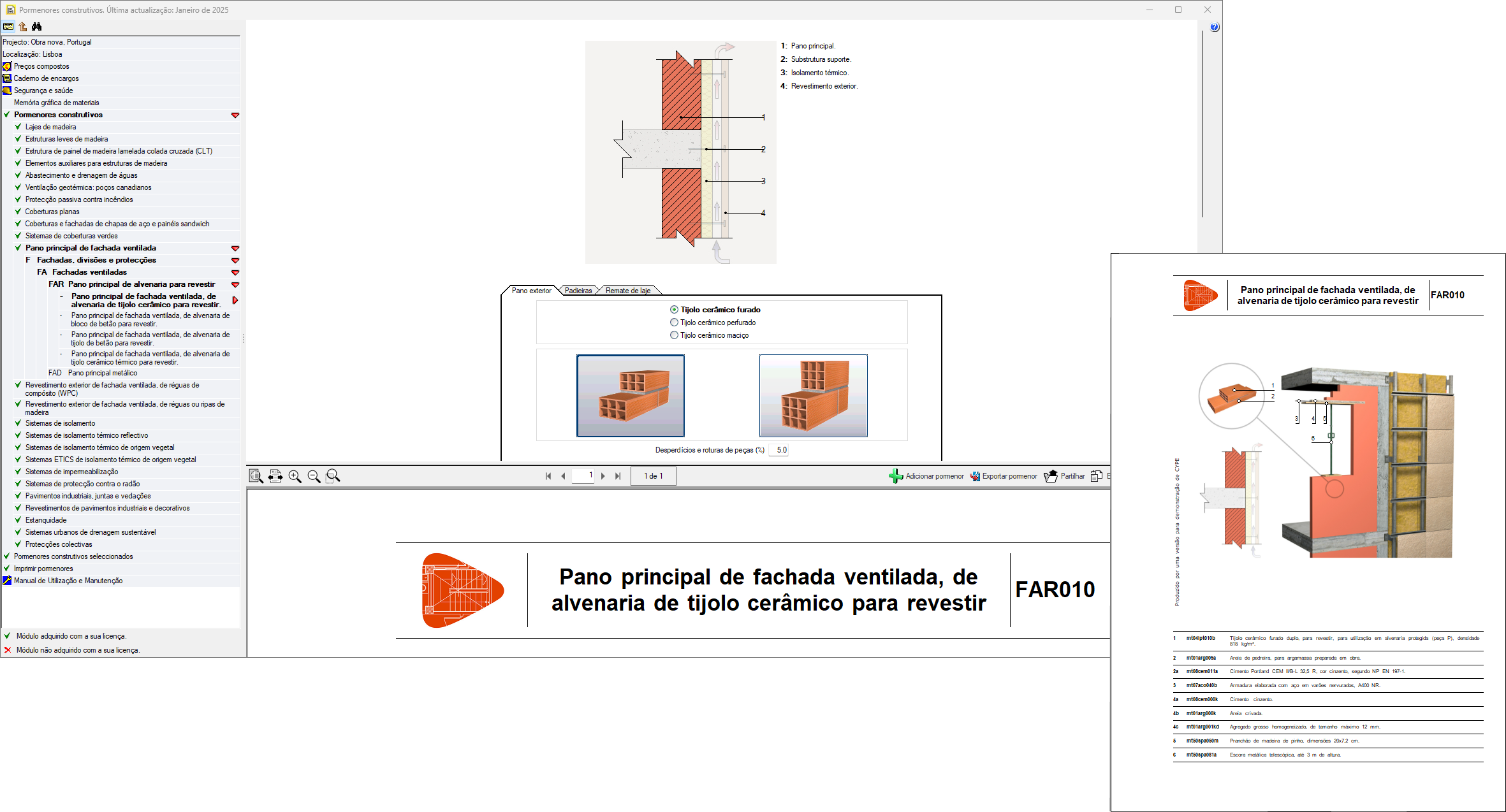 Esta secção, disponível em ambos os programas, inclui todas as unidades de obra que contêm pormenores construtivos. Estão ordenadas por módulos de pormenor e, em cada módulo, por capítulos e subcapítulos. Estas unidades de obra são visualizadas com os mesmos parâmetros que na secção “Preços compostos”, mas em vez de se poder consultar a composição, o caderno de encargos, a receção de materiais, os resíduos gerados, ou a energia incorporada e as emissões da unidade de obra, apenas se pode consultar o pormenor construtivo adaptado aos parâmetros selecionados (a composição, o caderno de encargos, os resíduos, etc., podem ser consultados em ambos os programas na secção “Preços compostos”).