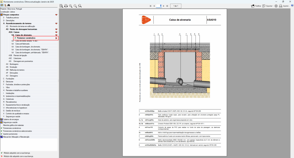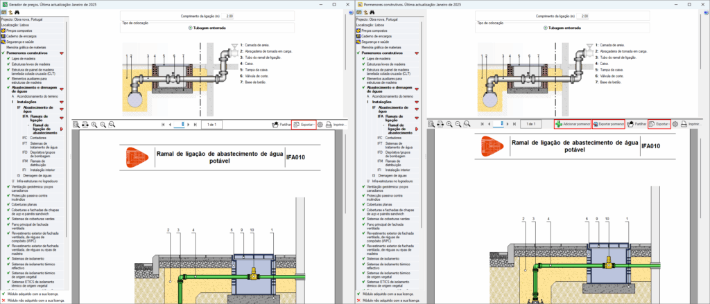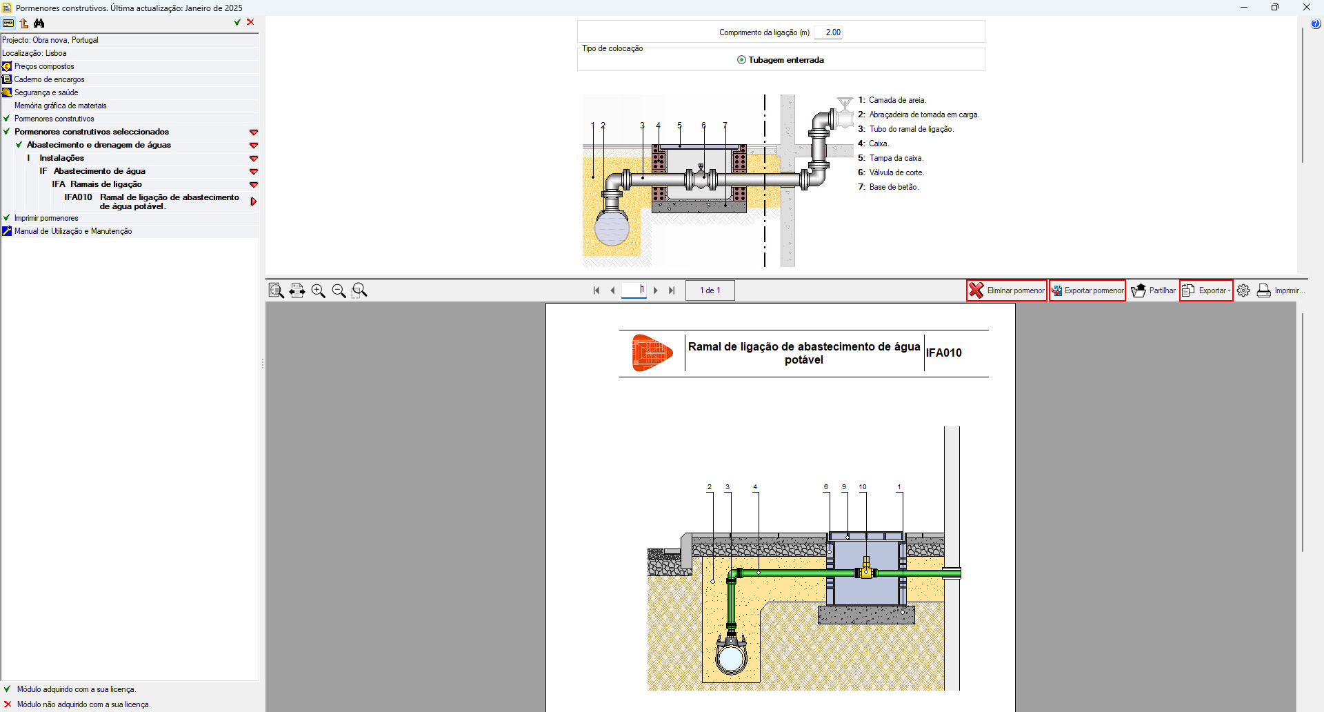 Com a opção “Exportar”, os dois programas podem gerar um documento que contém o pormenor construtivo selecionado. Este documento pode ser impresso diretamente ou exportado para um ficheiro em formato PDF, DOCX, HTML ou RTF. Exclusivamente no programa Pormenores Construtivos, cada uma das unidades de trabalho desta secção tem mais duas opções: