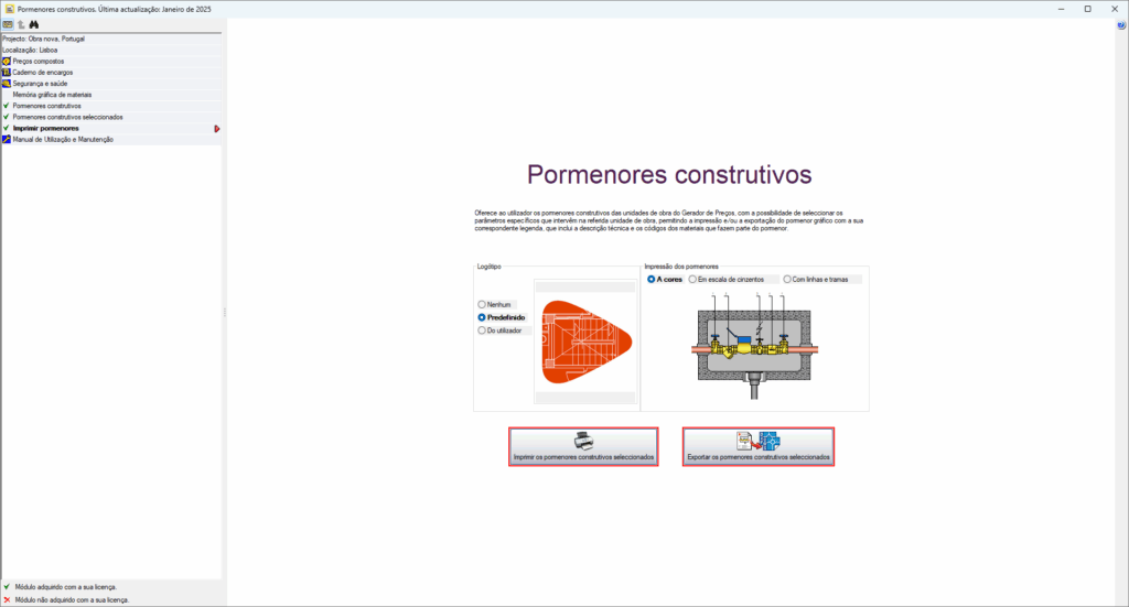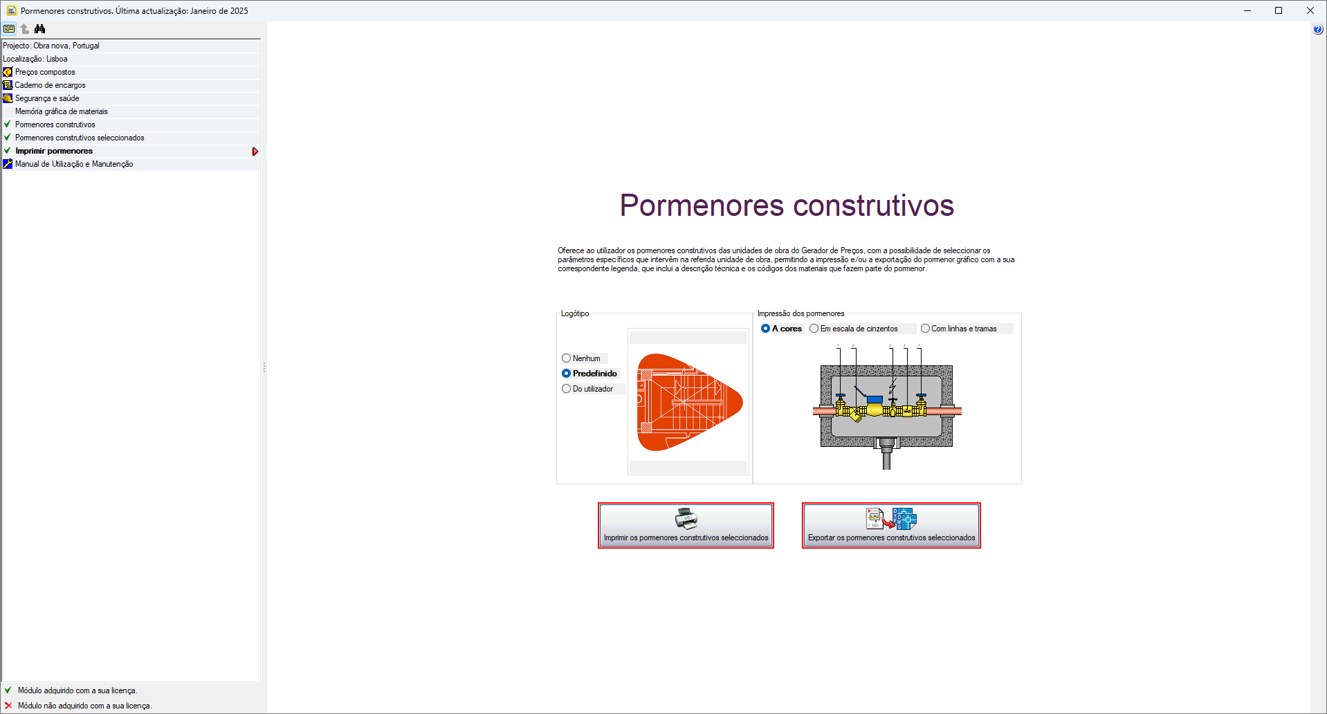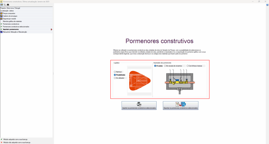 Como indicado anteriormente, os pormenores construtivos também podem ser impressos e exportados a partir das secções “Pormenores construtivos selecionados” e “Pormenores construtivos”, mas neste caso deve ser feito um a um. Nestas duas secções também é possível definir as opções que configuram o aspeto dos pormenores, e a sua modificação implica automaticamente a alteração nas restantes secções onde estas opções aparecem.
