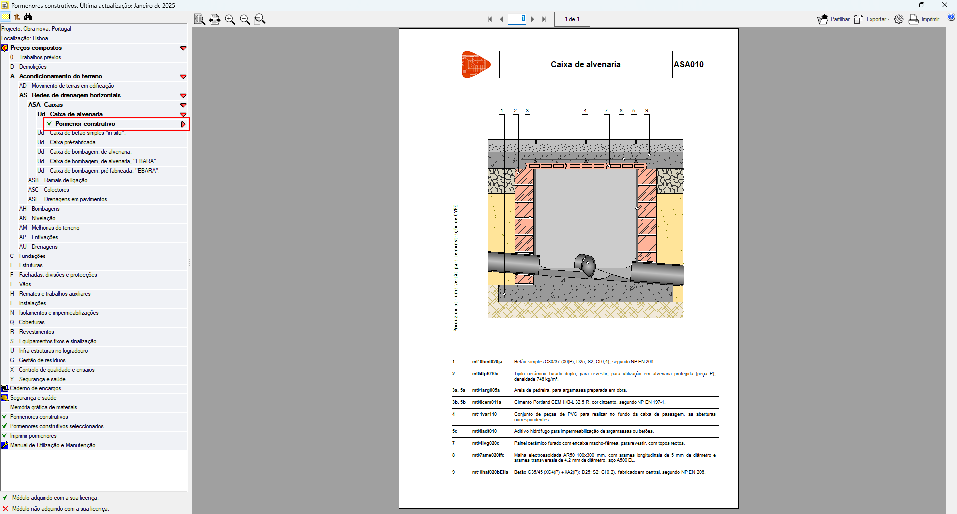 Os pormenores construtivos do Gerador de preços são gerados tendo em conta os parâmetros que o utilizador seleciona na unidade de obra do pormenor. Cada pormenor construtivo inclui: