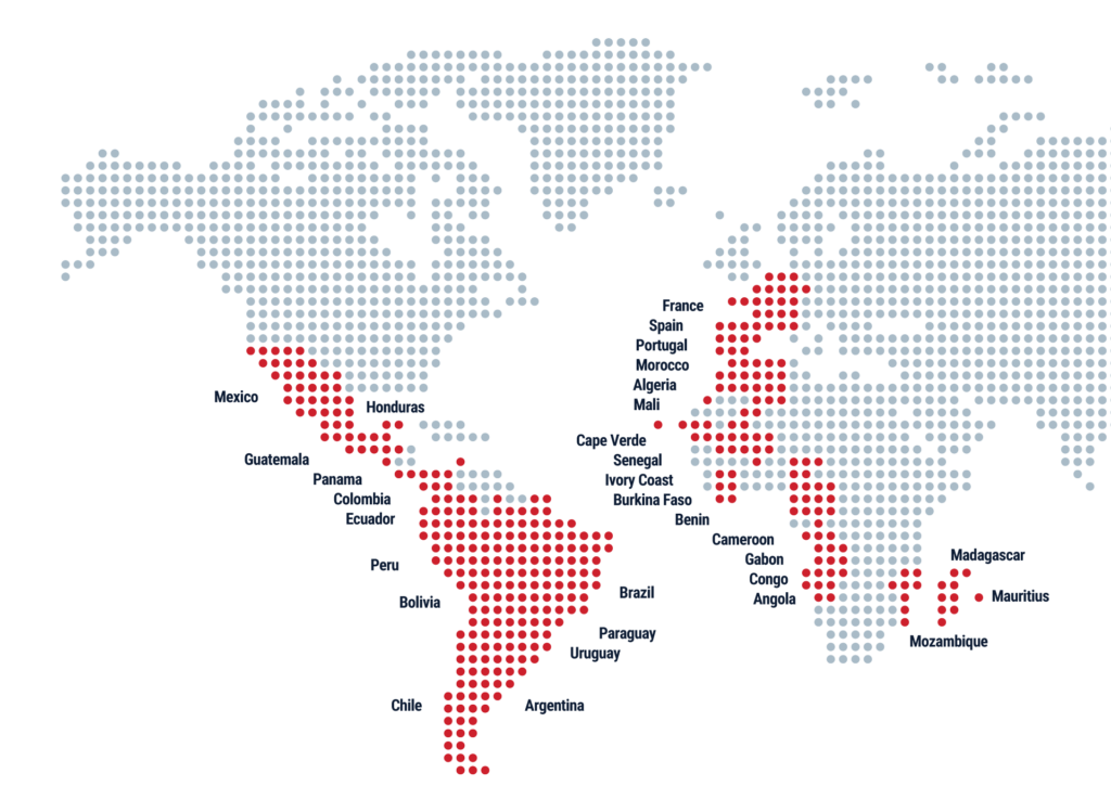 - em África: Argélia, Angola, Burkina Faso, Cabo Verde, Camarões, Costa do Marfim, Gabão, Mali, Marrocos, Moçambique, República do Benim, República do Congo, República de Madagáscar, República das Maurícias e Senegal;