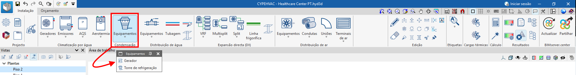 - Uma barra de ferramentas superior que contém as ferramentas para: gerir as opções do projeto; introduzir e editar os elementos dos sistemas de climatização por água, condensação, aerotermia e distribuição de água; introduzir os sistemas de expansão direta; introduzir os elementos da instalação de distribuição de ar; e efetuar o cálculo, a verificação e o dimensionamento da instalação.