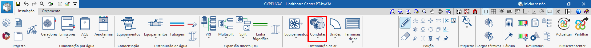 No bloco "BIMserver.center" da barra de ferramentas principal, dentro do separador "Instalação", encontram-se as funcionalidades necessárias para utilizar o CYPEHVAC em conjunto com outras ferramentas do BIMserver.center: