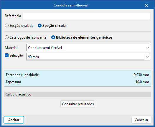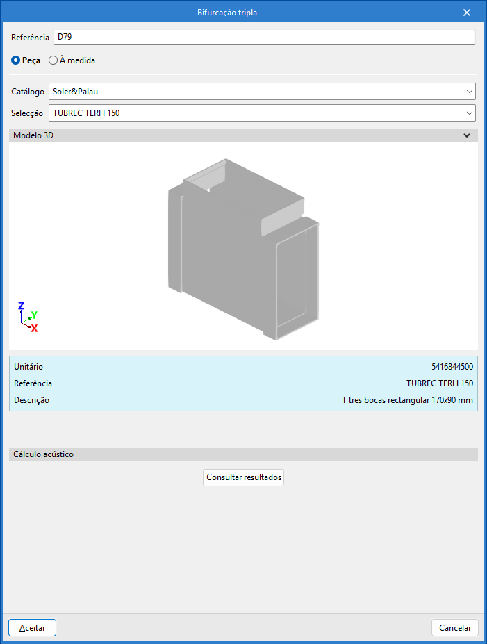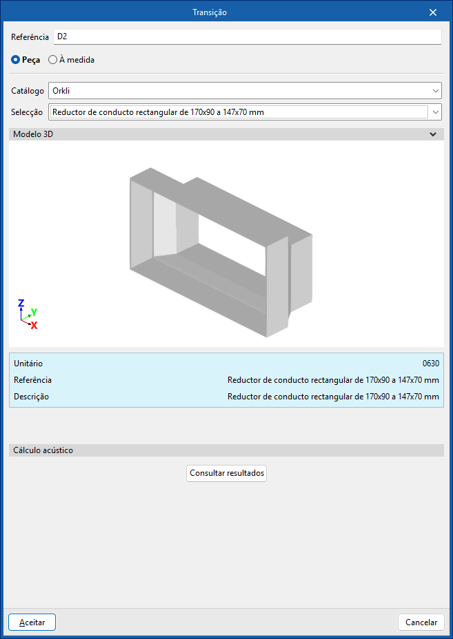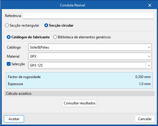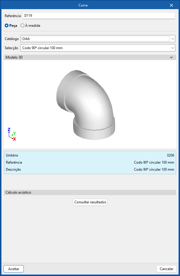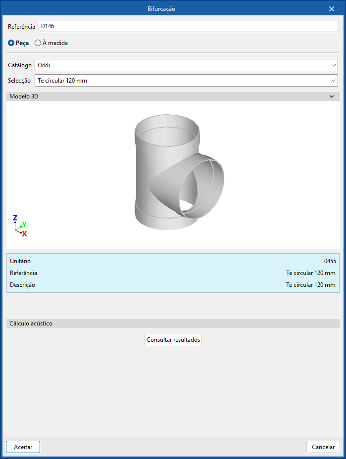 O programa permite consultar as listagens de resultados do cálculo acústico a partir do painel de edição de cada equipamento ou tramo de conduta, na secção “Cálculo acústico”, premindo em seguida em “Consultar resultados”.