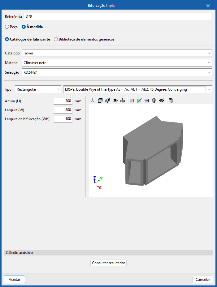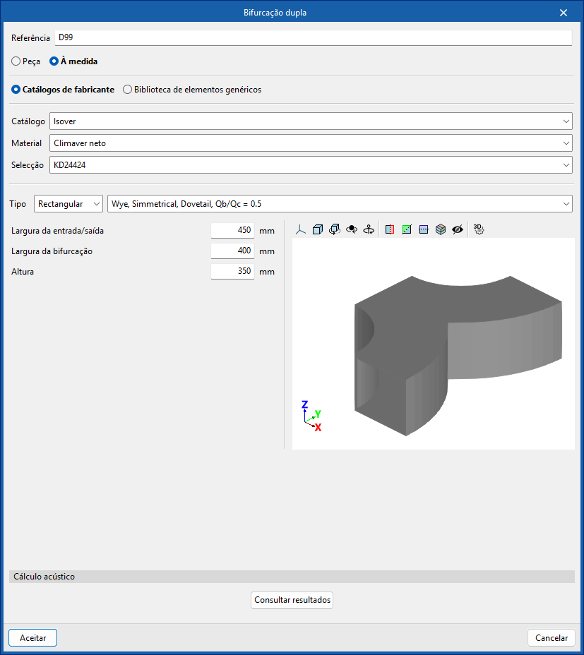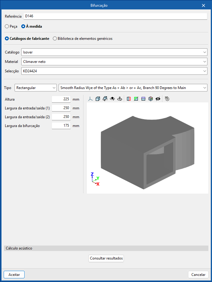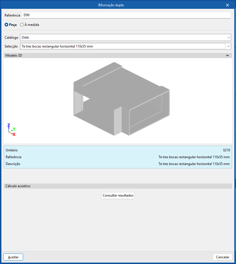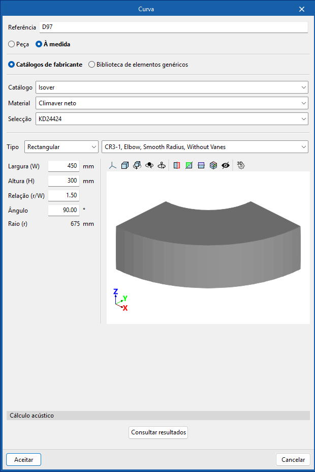 O programa permite consultar as listagens de resultados do cálculo acústico a partir do painel de edição de cada equipamento ou tramo de conduta, na secção “Cálculo acústico”, premindo em seguida em “Consultar resultados”.