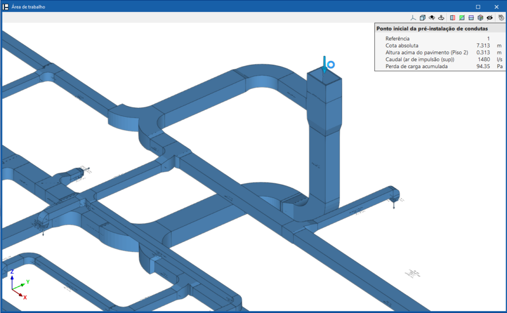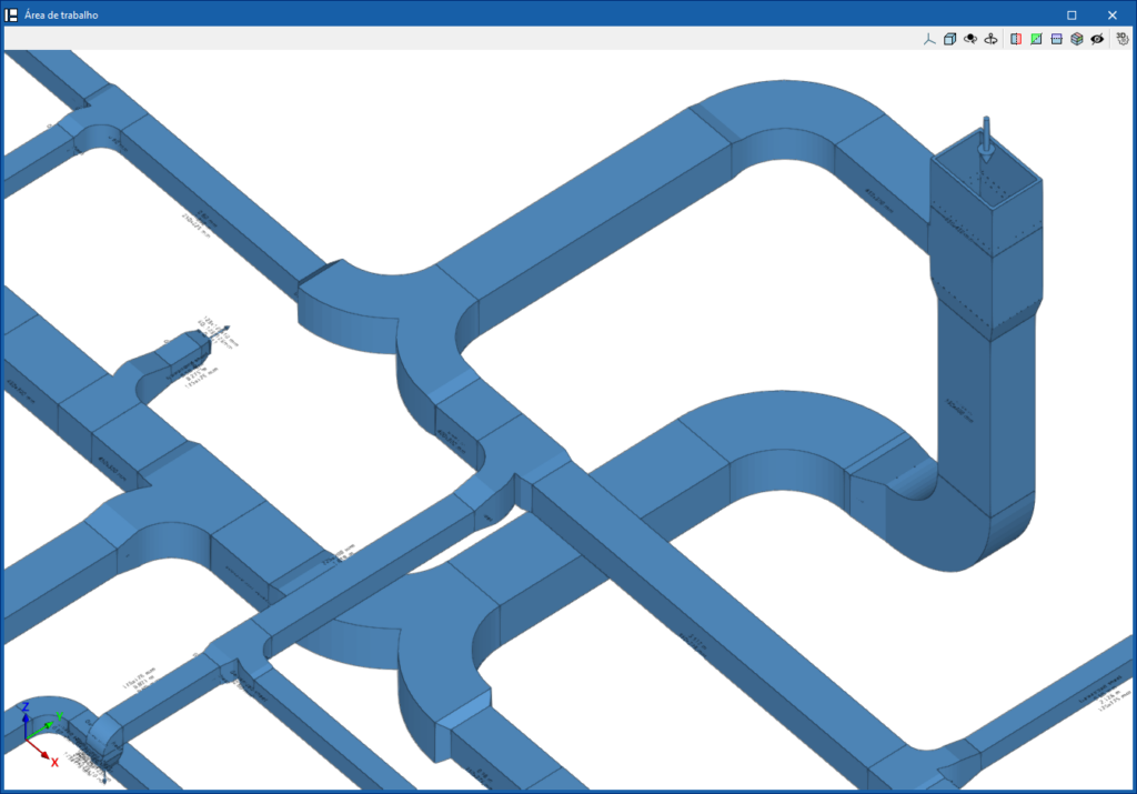 Também é possível visualizar os resultados de forma gráfica, colorindo os tramos da conduta no modelo através da “Análise gráfica dos resultados”, selecionando as opções “Perda de calor (Aquecimento)”, “Perda de calor (Arrefecimento)” ou “Acústica” na sua configuração.
