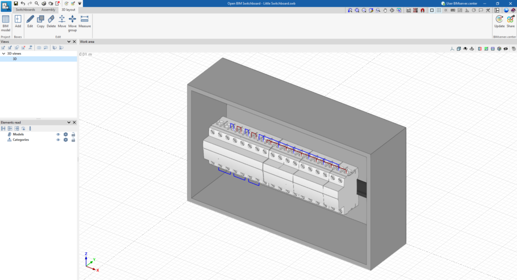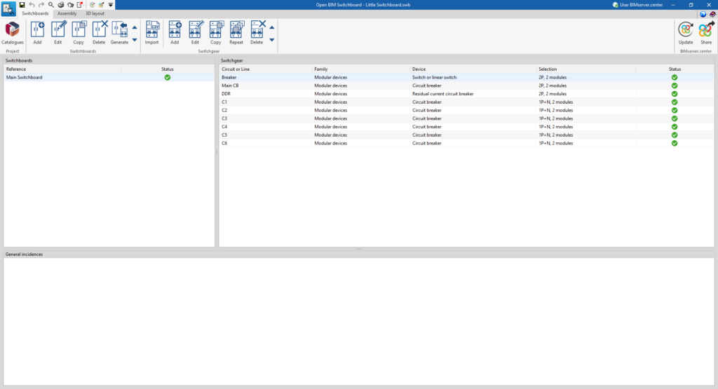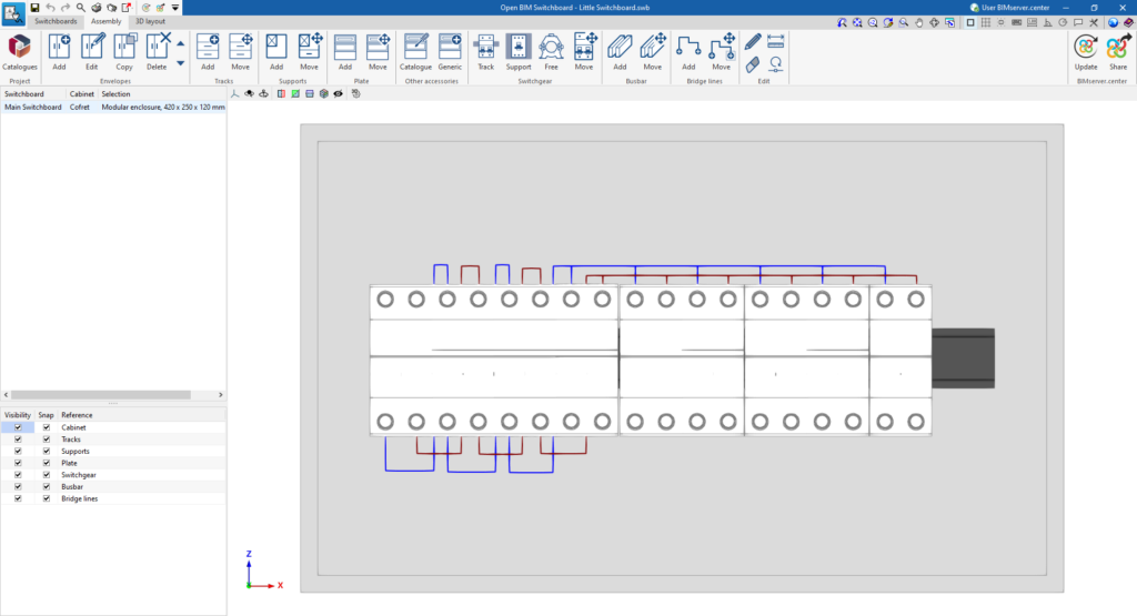 Se se vincular a obra do Open BIM Switchboard a um projeto BIM da plataforma BIMserver.center, é possível importar os quadros gerais e quadros parciais elétricos da instalação, juntamente com a aparelhagem de cada um deles, incluindo a definição de barramentos e linhas de ponte a partir da informação lida do modelo BIM. Uma vez gerados os quadros gerais e quadros parciais, estes podem ser modificados utilizando as ferramentas correspondentes sem qualquer tipo de restrição. Entre as opções disponíveis encontram-se as seguintes:
