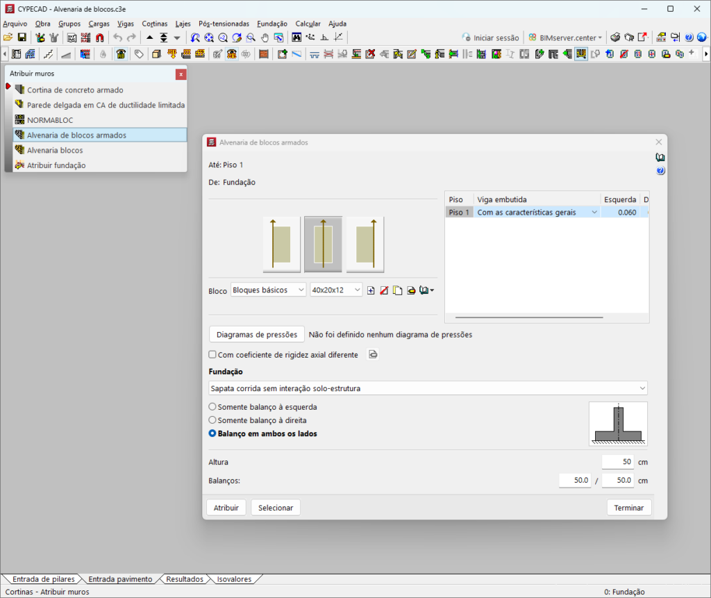 Para que o CYPECAD possa calcular e dimensionar alvenaria de blocos de concreto, é necessário que a licença do utilizador inclua, além do CYPECAD, o módulo "Alvenaria de blocos".