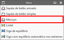 A introdução de maciços é feita através da opção "Fundação" no menu "Novo" do bloco "Elementos de fundação", no separador "Fundação".