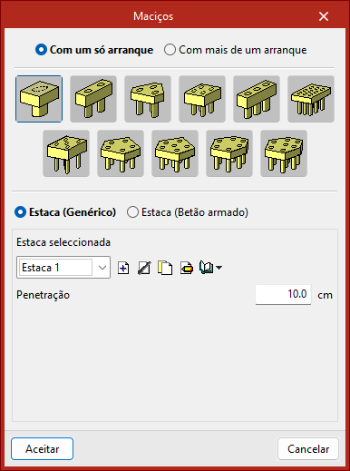 Ao selecionar esta opção, na janela que surge aparecem as opções "Com um só arranque", se um maciço suportar as cargas de um único pilar, ou "Com mais de um arranque", no caso de um maciço comum a vários pilares.