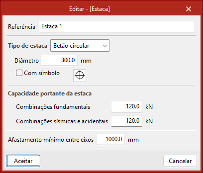 A "Capacidade portante da estaca" é a carga máxima de serviço de projeto suportada pela própria e é um valor que deve ser fornecido pelo utilizador. O programa avisará se este valor for excedido após a distribuição de esforços calculada no maciço. Este valor deve ser definido para "Combinações persistentes" e para "Combinações sísmicas e acidentais".