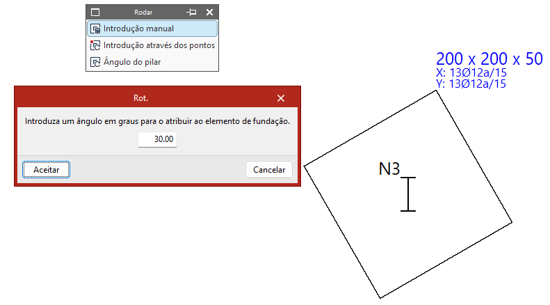 - Se for selecionada a opção “Introdução manual”, deve introduzir-se um ângulo em graus para o atribuir ao elemento de fundação. Após premir "Aceitar", selecione os elementos com o botão esquerdo e confirme com o botão direito.