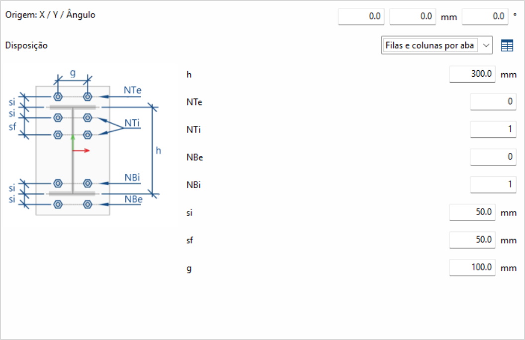 É possível editar a origem do sistema de referência local de aberturas, parafusos e fixações. Acima da tabela de edição de coordenadas, aparece a secção “Origem” com a edição dos deslocamentos ‘X’ e “Y” e do ângulo de rotação. Esses deslocamentos são aplicados ao grupo de elementos que contém a tabela. Em parafusos, o sistema de referência original corresponde ao da primeira placa. Em ancoragens e aberturas, corresponde ao da placa selecionada.