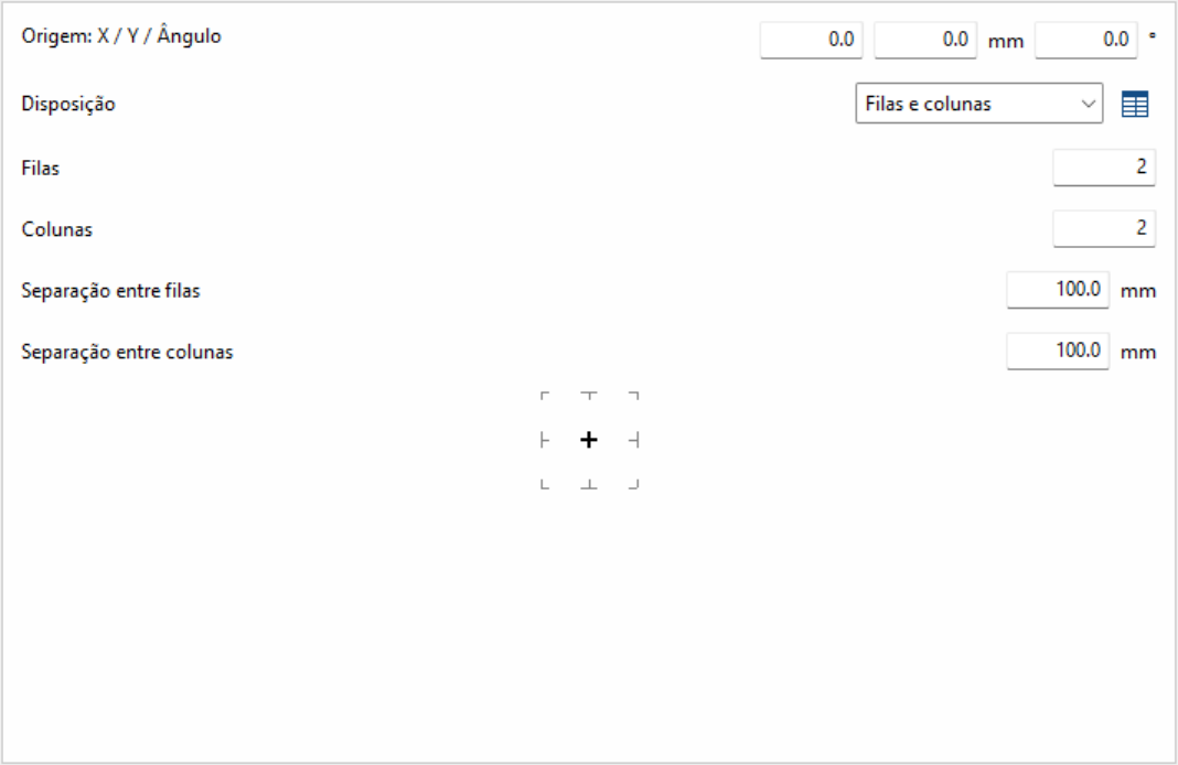Distribui os elementos de forma regular em filas e colunas, definindo o número de elementos por fila e coluna e a separação entre eles. É uma opção prática para configurações homogéneas.