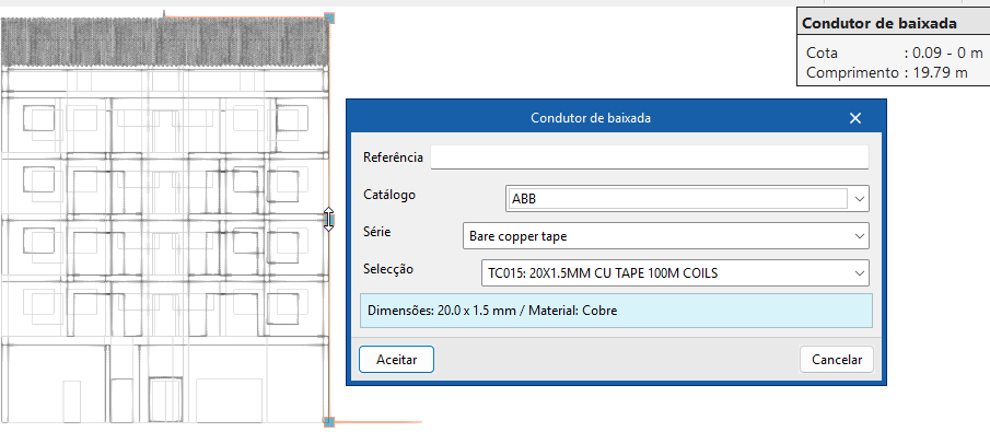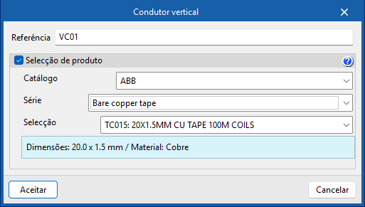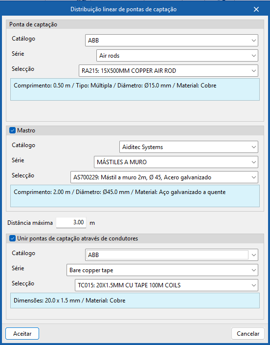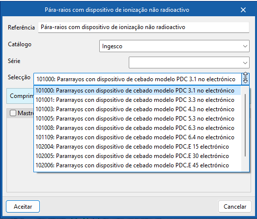 Esta opção deve ser marcadas se pretender gerar os condutores que unem as bases das pontas de captação.- Catálogo / Série / Seleção