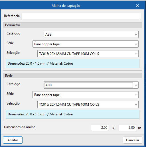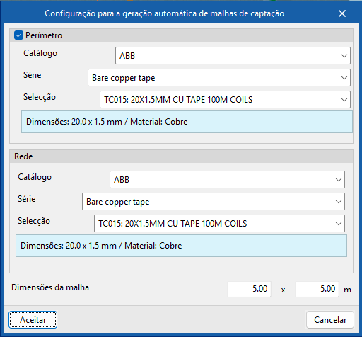 Define-se a cablagem do perímetro da malha.- Catálogo / Série / Seleção