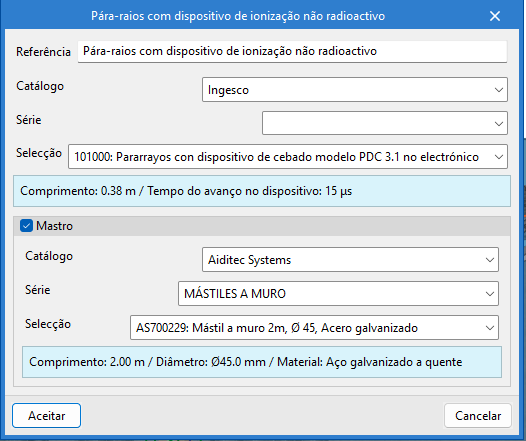 O programa permite selecionar um modelo de para-raios a partir dos catálogos dos fabricantes incluídos na Open BIM Database. - Mastro