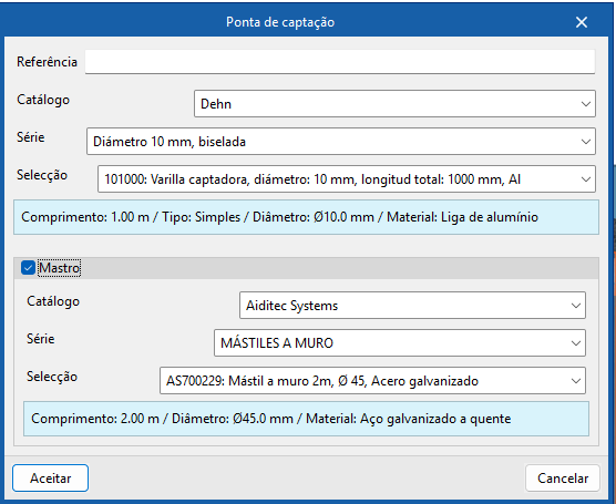 O programa permite fazer a seleção de um modelo de ponta de captação dos catálogos de fabricante incluídos na Open BIM Database.