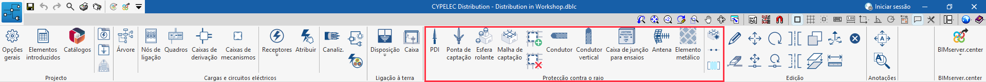 No grupo "Proteção contra o raio" da barra de ferramentas principal, encontram-se as opções para conceber uma instalação de proteção contra o raio através de um para-raios com dispositivo de ionização (PDI):