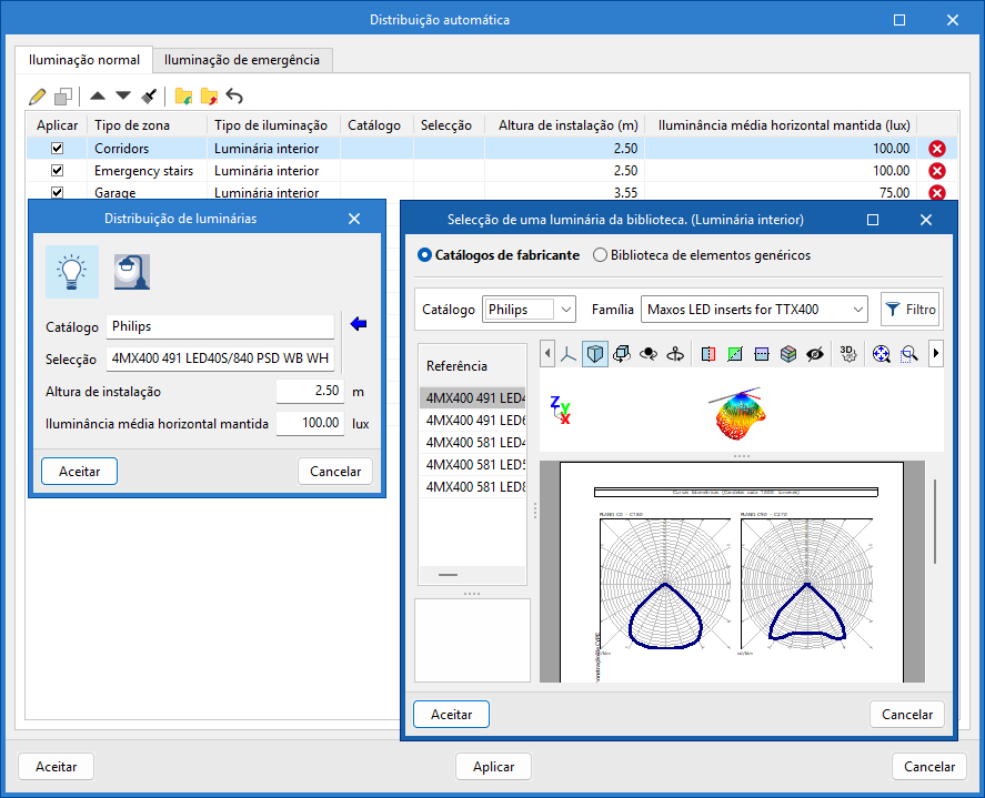 O programa gera uma distribuição otimizada das luminárias através da seleção do produto a ser utilizado em cada tipo de compartimento, acedendo ao catálogo do fabricante escolhido e definindo tanto a altura de instalação como a iluminância média horizontal mantida.